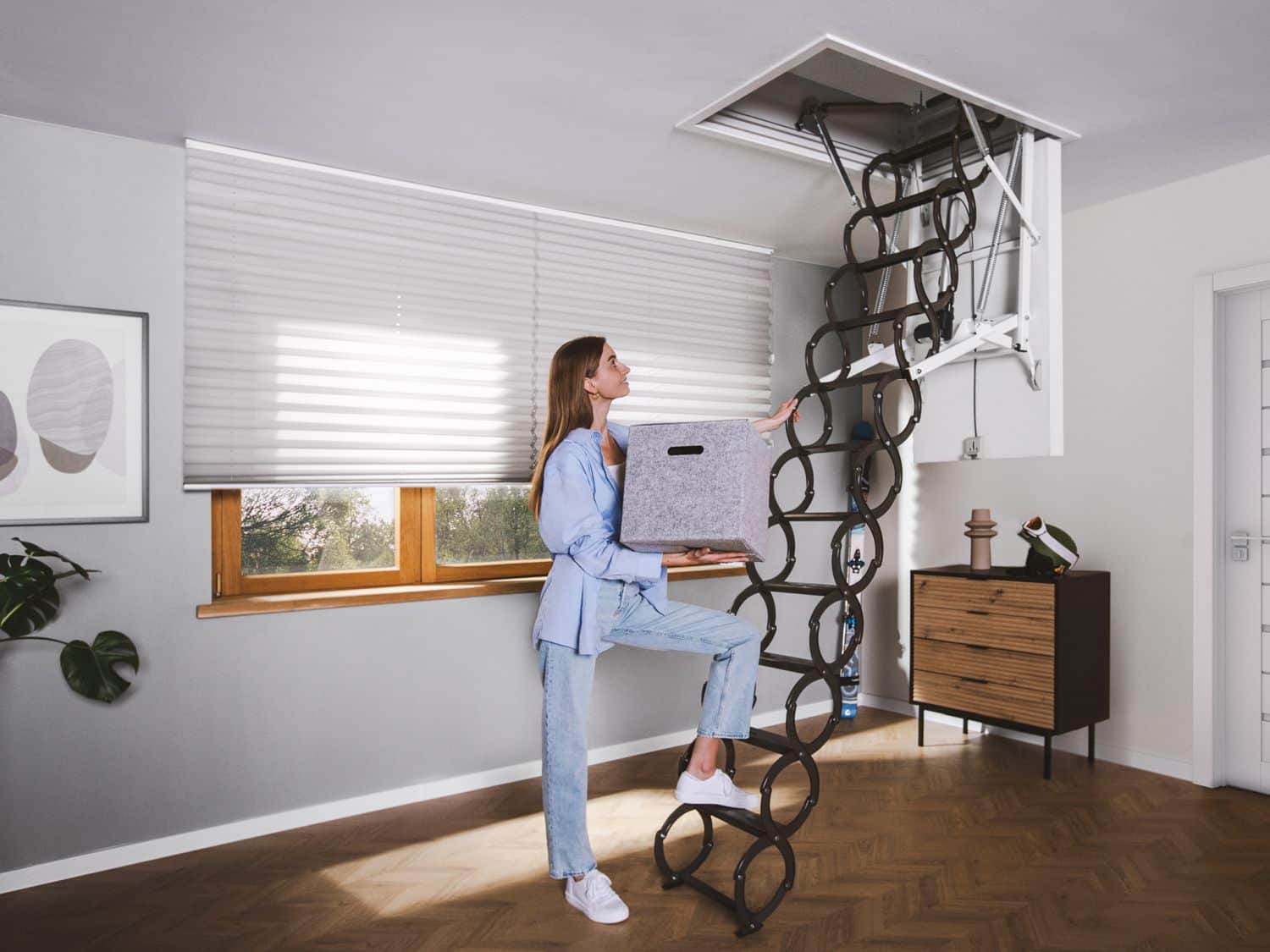 Gombnyomás, és nyílik az út a padlásra – a FAKRO LET Electric egy új korszakot hoz a padlásfeljárók világába! Ez az ollós szerkezetű, teljesen elektromosan működtethető lépcső Z-Wave vagy WiFi vezérléssel könnyíti meg az életed, akár egy távirányítós csoda. Nincs többé hajlongás, erőlködés vagy bonyolult kihúzás – a standard falikapcsolóval gyerekjáték a használat, miközben a lépcső elegáns fehér ajtólapja diszkréten simul a mennyezetbe. A kimagasló hőszigetelés és a prémium minőségű fém létraszár gondoskodik arról, hogy ne csak okos, de megbízható is legyen. A jövő már a padláson van – csak meg kell nyomni a gombot.